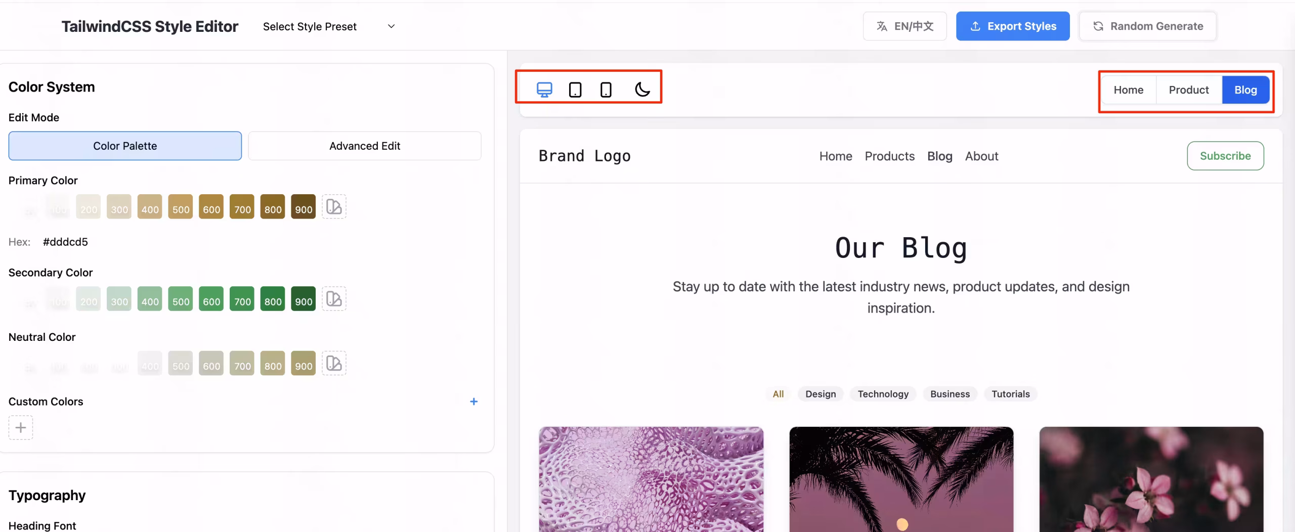 首先你可以在页面左侧对网页样式进行调整,比如主题色、辅助色、字体、大小、字间距、按钮样式等。